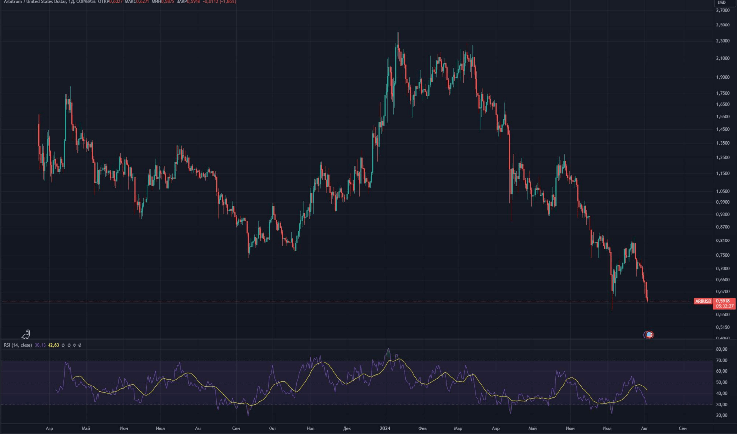 ARB token is currently at historic lows around $0.60, the 14-day Relative Strength Index (RSI) is showing 30 pips indicating that the price is currently entering oversold territory and has potentially formed a double bottom.
