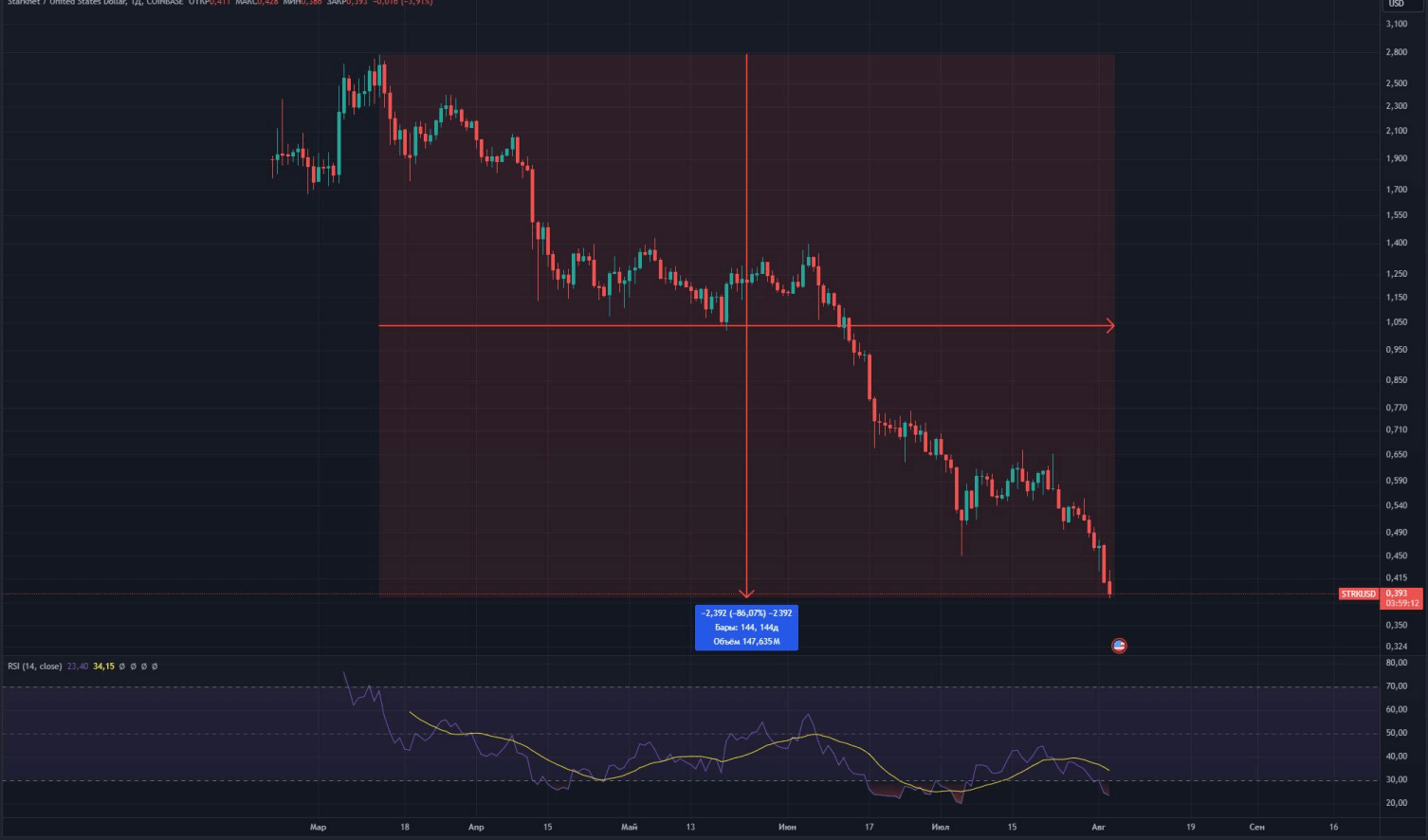 At the moment STRK price is at the historical lows at $0.39, from the historical maximum the price has dropped by more than 86%, and the relative strength index (RSI) has fallen into the zone of strong oversold. This token can now safely start to buy back with a ladder, with the nearest target of fixing the profit in the area of $1.