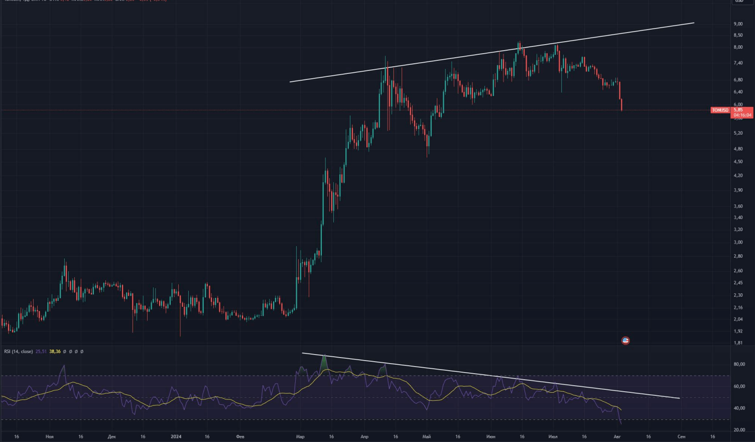 Thanks to Proof-of-Stake (PoS) consensus, Toncoin now allows for instant payments using a fully decentralised storage and Domain Name System (DNS). Currently on the daily chart, the price of TON is in a bearish divergence against the Relative Strength Index (RSI). Locally, it is very probable that the coin will go for a correction, so it makes sense to wait a bit to enter at a more favourable price.
