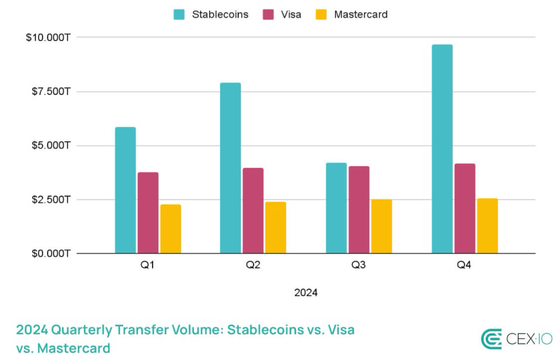 the annual volume of payment transactions in stablecoins amounted to $27.6 trillion, thus exceeding the same indicator of fiat transfers in total for Visa and MasterCard payment systems by 7.68%;