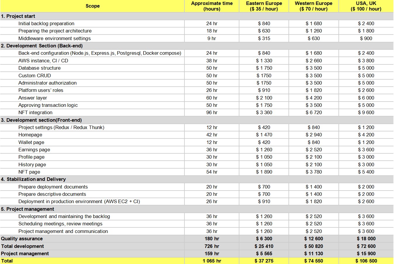 As you have seen, the development of a music NFT marketplace has its own challenges, but in general, projects of this type have common features with large platforms. Below is a rough price for developing a music NFT marketplace, but it's worth noting that prices can start as low as $20,000 for a simple site with a small admin panel. More complex solutions can cost up to $80,000. Purchased projects have much more options for visitors and management in the admin panel. Therefore, the cost of such projects can reach $300,000 or more.