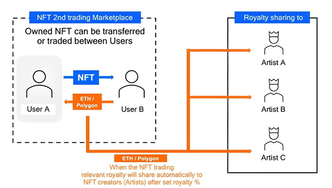 An example of an automatic revenue distribution of royalty on an NFT marketplace.