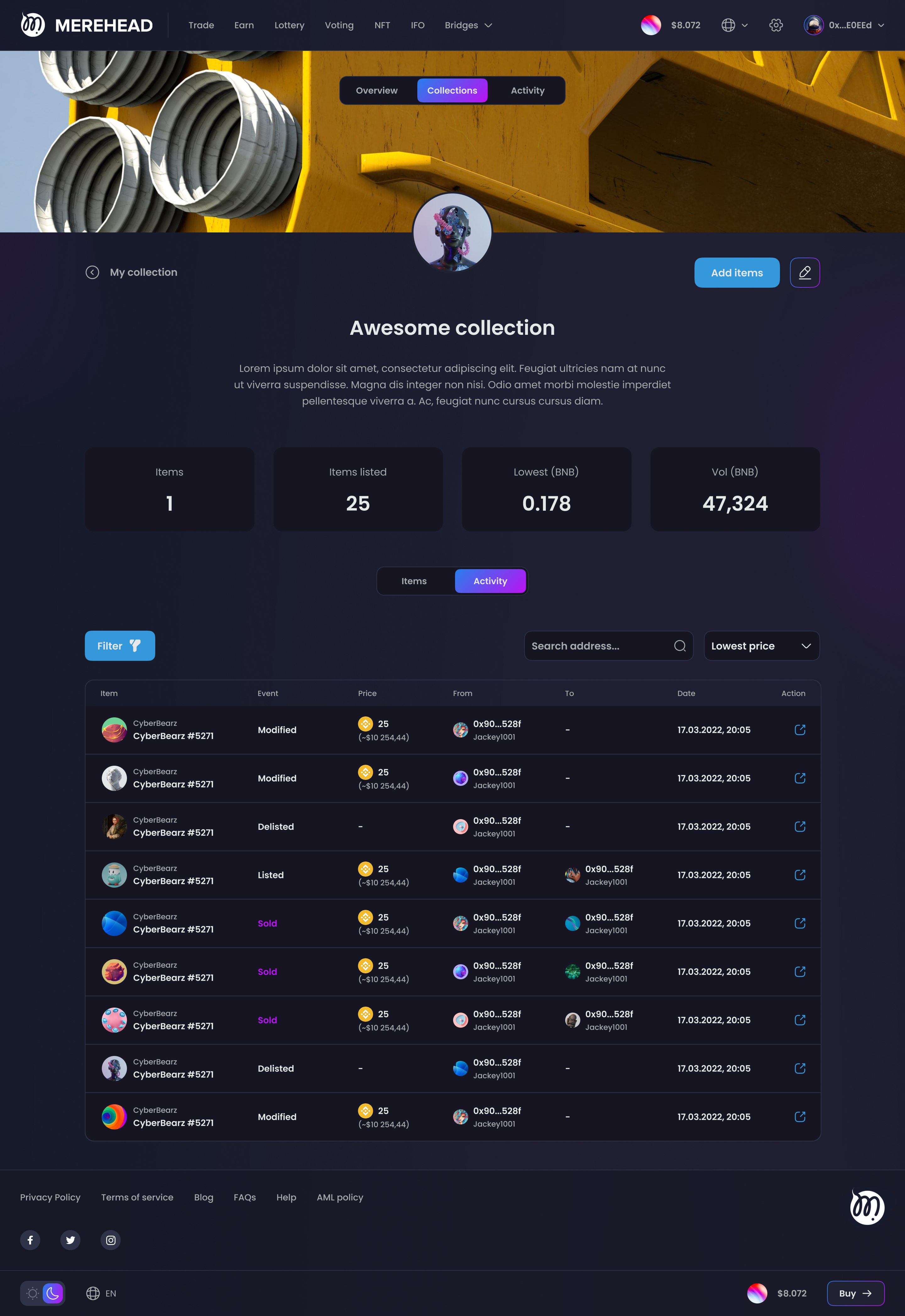 NFT Marketplace — it is an online platform that allows users to create (mine), buy, sell, exchange NFTs, and own collectibles. Such platforms operate on the basis of smart contracts, including NFT marketplace smart contracts, NFT marketplace contracts, and marketplace contracts, most often built on blockchains such as Ethereum blockchain, Tezos blockchain, Solana, Binance Smart Chain, Polygon and others. They act as intermediaries between content authors (artists, designers, developers, NFT artists, NFT creator) and collectors, ensuring transparency of transactions, secure data storage and transaction automation within the broader NFT space.
