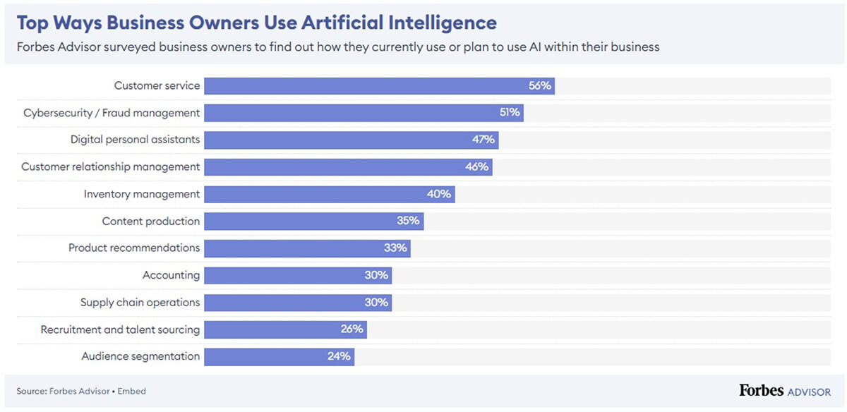 Forbes Advisor survey, in which more than 600 businesspeople from various fields participated, companies are actively integrating artificial intelligence into their work. The priority segments are cybersecurity, technical support for customers, content generation, and fraud prevention.