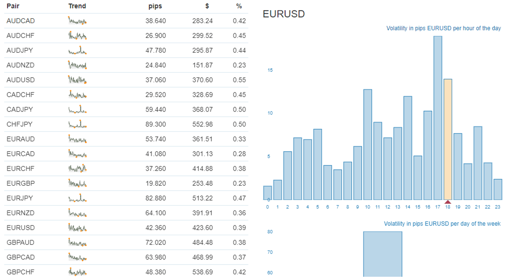 For analytics, hundreds of indicators are used. Traditional “line” and “step”, “mountain” with “candlestick”, histogram and scatter chart visualize the course with different depiction of spread and direction. Refining indicators offer advanced breakout analytics with bounces. This list includes: