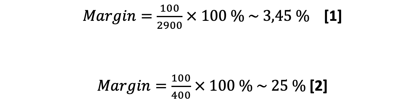 For example, a broker provides $2900 of leverage for a $100 trader. That is, only 3.45% or $3.45 of the trader's capital will be blocked [formula 1]. In the case when the leverage for this amount is $400, the amount of blocked funds will increase to $25 [formula 2].