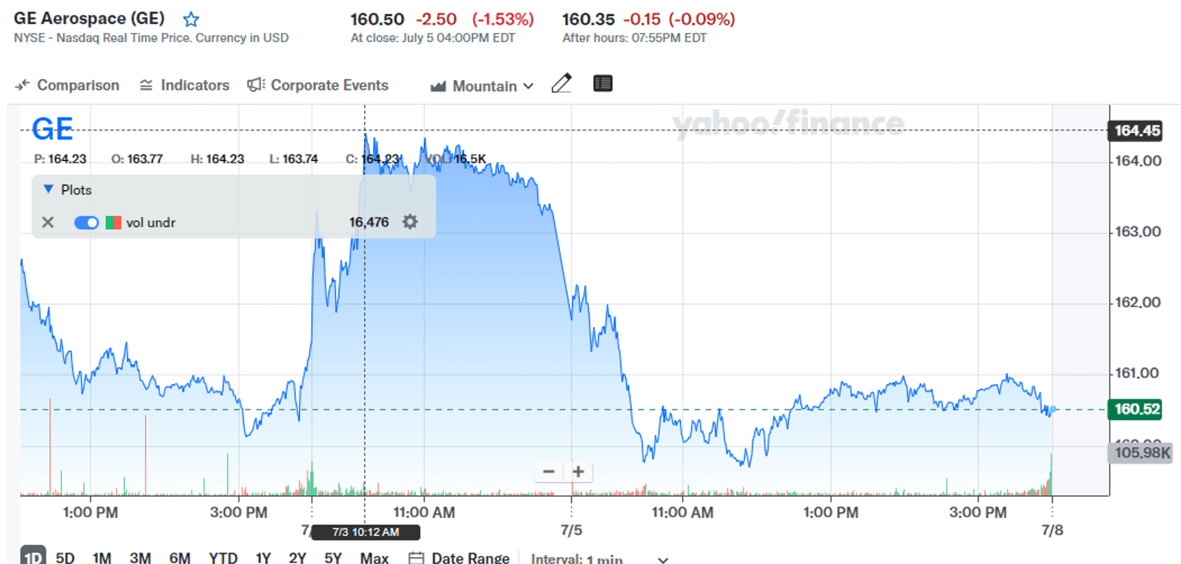 The example of GE Aerospace company shows how the rate reaches $165 at the peak and falls to $160 and even lower within a day. If a trader takes a broker's leverage of 1 to 5 on his $165 and buys 6 shares for $990, then a day later the gross profit on shorts will be $30. In case, on the other hand, when the forecasts do not come true and the rate goes up, the trader will make a loss on the amount by which the stock will increase. That is why short positions are constantly set at a high risk level.
