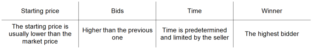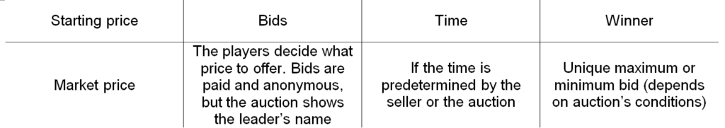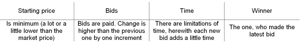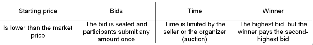 A unique bid auction. It’s frequently used on online markets to entice buyers with intrigue, excitement, and opportunity to save. Relatively cheap and not so necessary things for the buyer are sold with its help: jewelry, gadgets, interior items, toys, etc.
