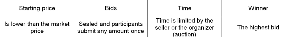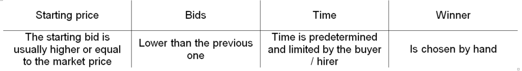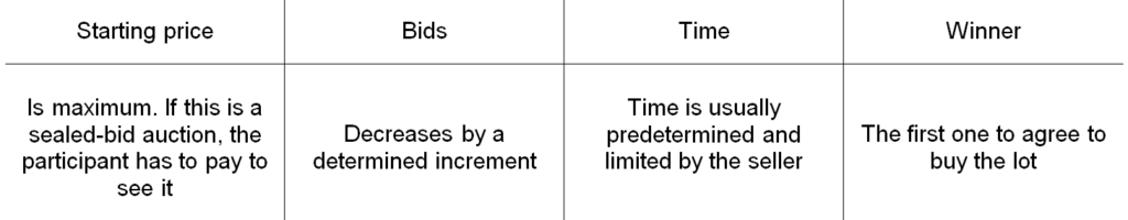 A reverse auction (Dutch). It’s used when parties at the auction swap the positions: the buyers accept bids from item sellers and service providers receive bids from potential buyers. For instance, when a large company conducts a massive tender for the purchase of construction materials or when the government is looking for a contractor to clean streets.
