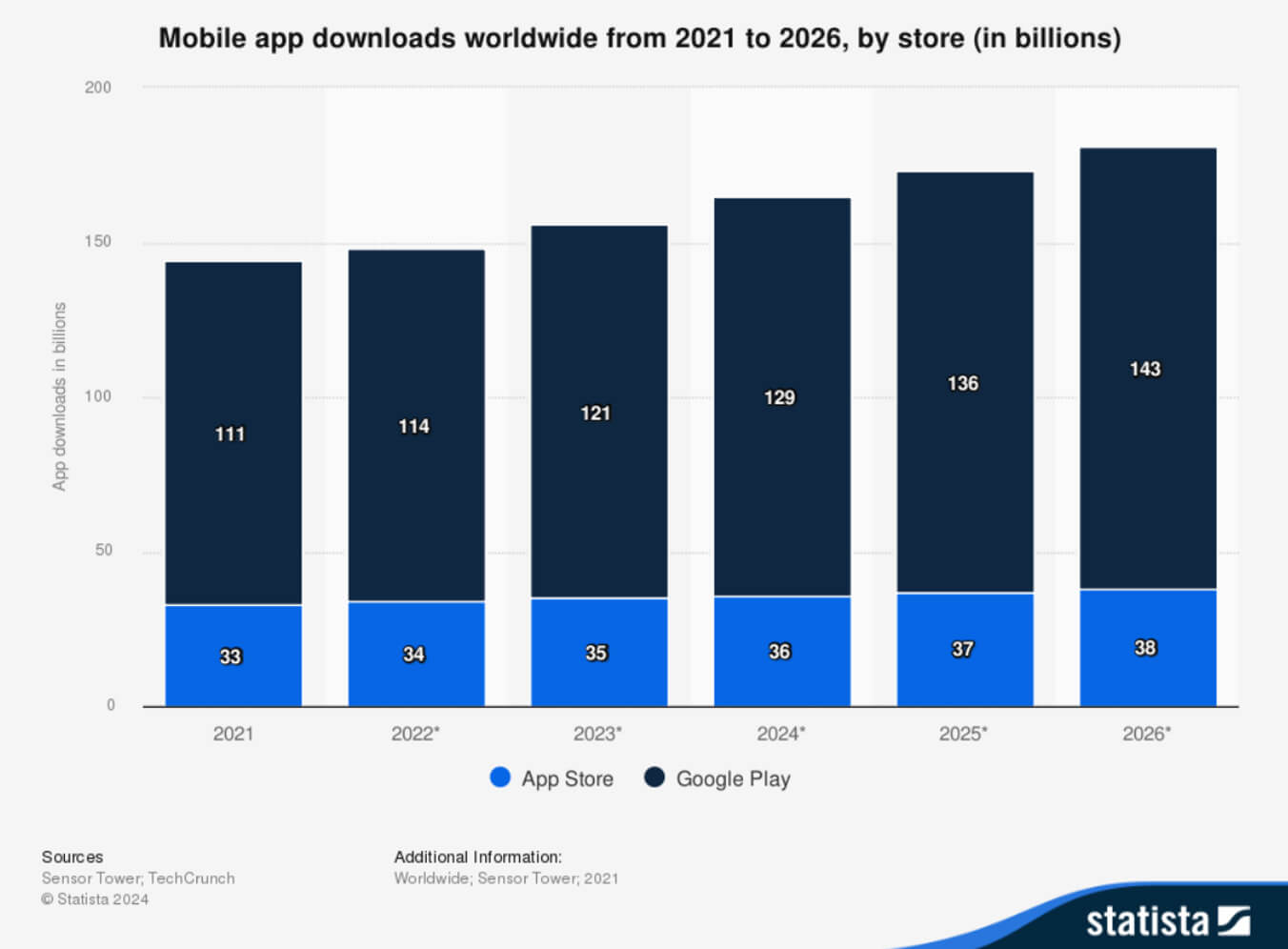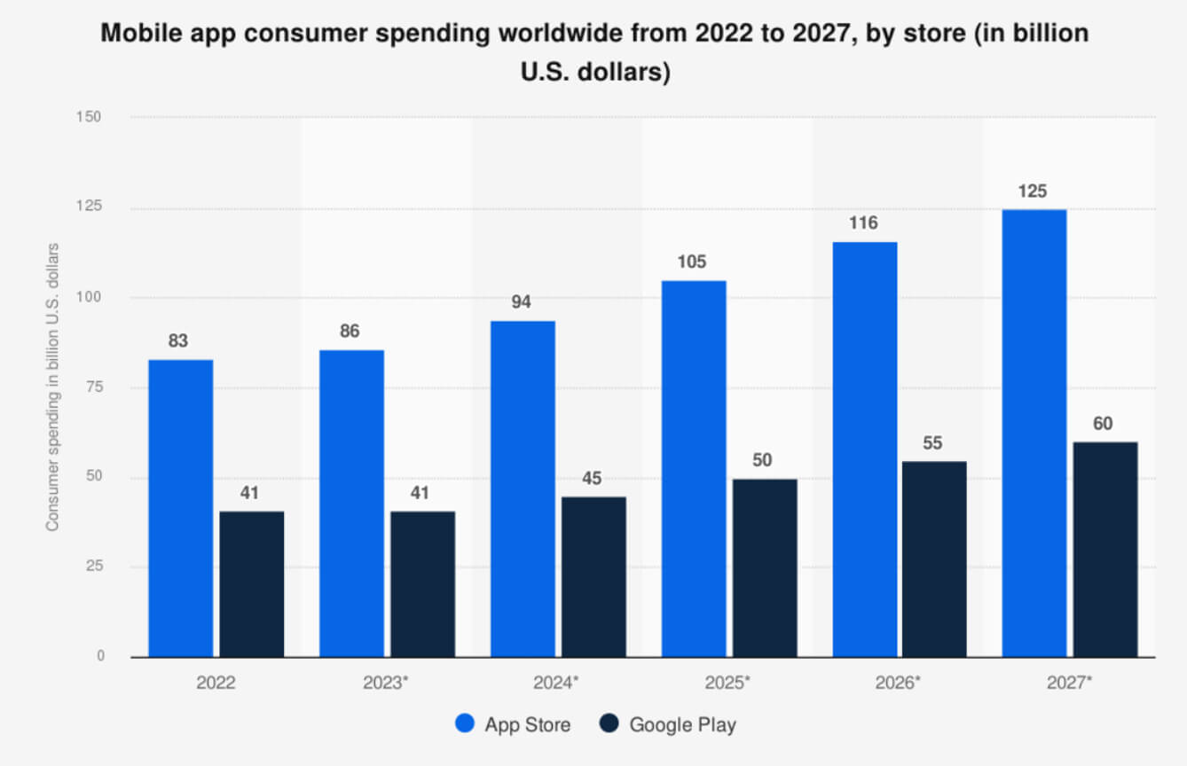 Experts predict that by 2033, the global mobile app market will grow to $553.57 billion, maintaining an average annual growth rate of 18.25%.