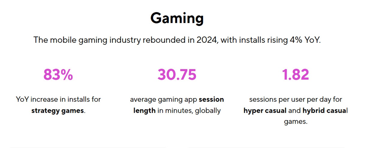 According to Adjust’s “Mobile App Trends 2025” report, the number of game installations worldwide grew by approximately 4% in 2024, and the average session duration in gaming apps in some categories exceeds 30 minutes per day.