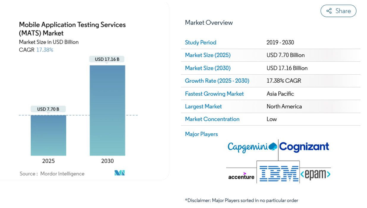 Market growth is driven by demand for quality. Today, the mobile application testing services market is valued at $7.70 billion and is projected to grow to $17.16 billion by 2030, with an expected average annual growth rate of approximately 17.4%.
