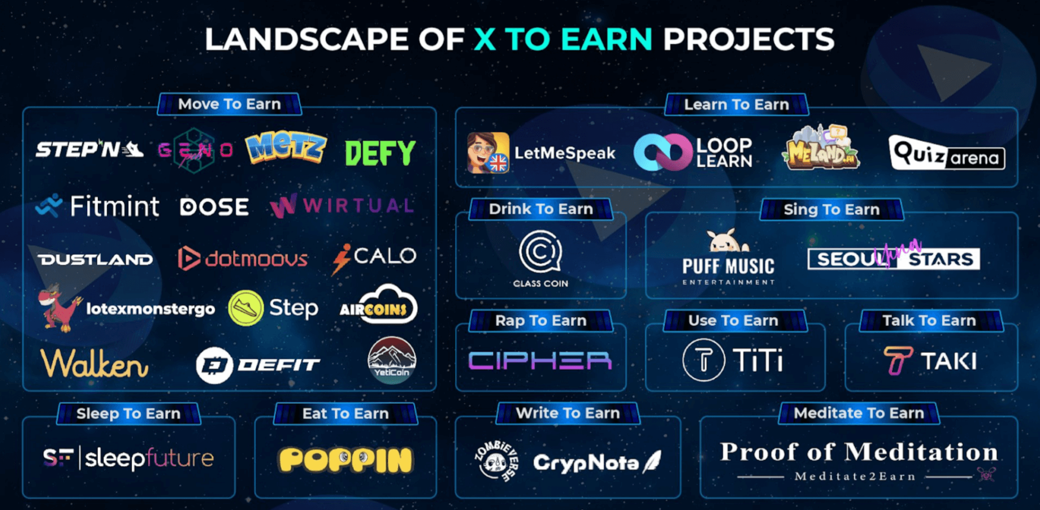 X-To-Earn is a concept of decentralized games in which users are rewarded for some action. The most popular types of X2E games include: "play to earn" (P2E), "learn to earn" (L2E), and "move to earn" (M2E).
