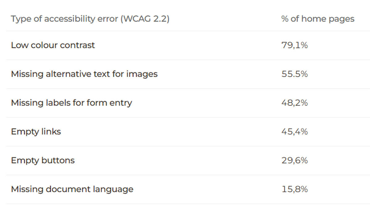The WebAIM study notes that many websites still fail basic accessibility checks. In 2025, 94.8% of homepages contained detectable WCAG 2 violations, and automated scanning revealed an average of 51 errors per page.