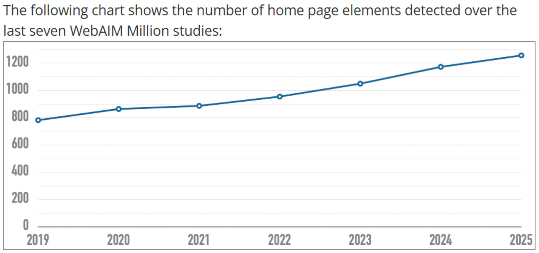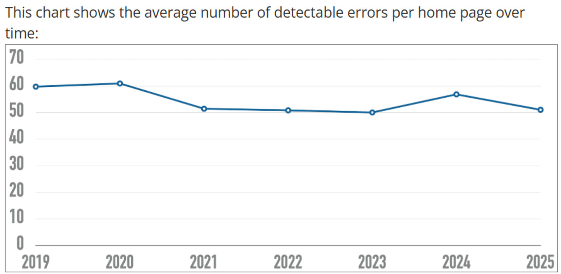 On average, a single website page contains 51 errors. In addition, the number of elements present on websites continues to grow each year. In 2025, the average number of elements is estimated at 1,257, which is 7.1% higher compared to 2024.