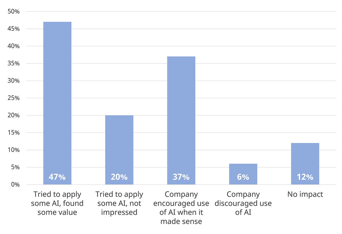 According to the 2024 UXPA/MeasuringU survey, 53% of UX professionals expected a significant increase in the use of AI in the following year, while 36% anticipated that the usage level would remain the same.