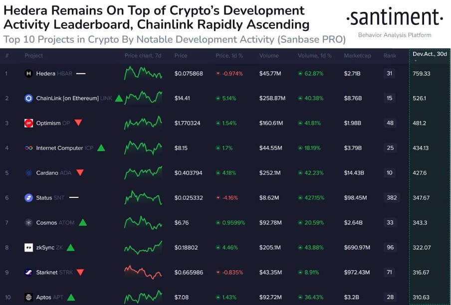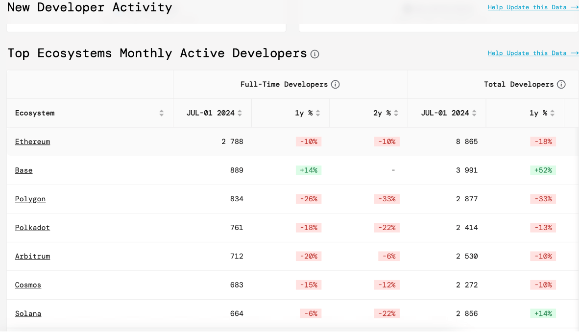 Tatsächlich gehörte das Optimism-Team laut den Ergebnissen vom Juli 2024 zu den Top-3-Projekten in Bezug auf die Entwickleraktivität (Santiment Daten). In dieser Bewertung sind 5 weitere Projekte aus unserer Liste enthalten.