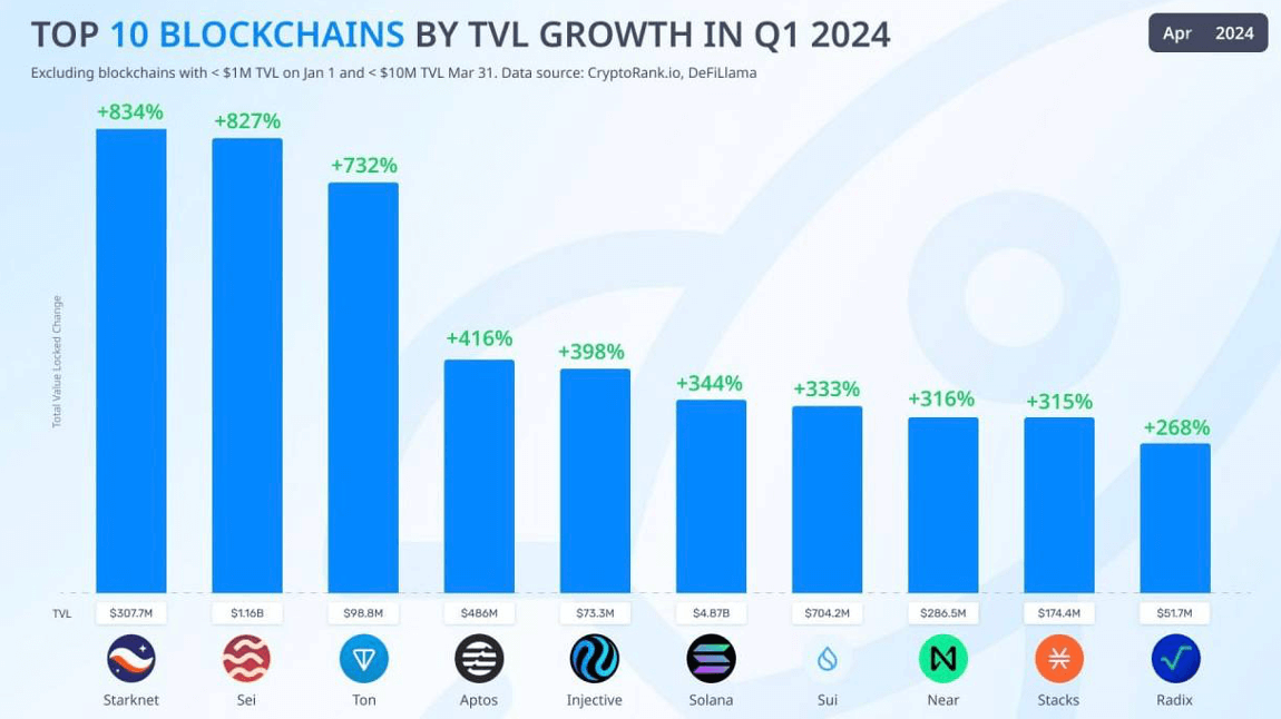 Im ersten Quartal 2024 belegte SEI in Bezug auf das TVL-Wachstum den zweiten Platz unter den Top 10 Blockchains. Ein hoher TVL weist auf eine breitere Akzeptanz und Aktivität im Ökosystem hin, daher raten wir Ihnen, diesem Blockchain-Token Aufmerksamkeit zu schenken. Er wurde in unser Ranking der perspektivischen Altcoins 2025 aufgenommen.