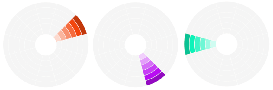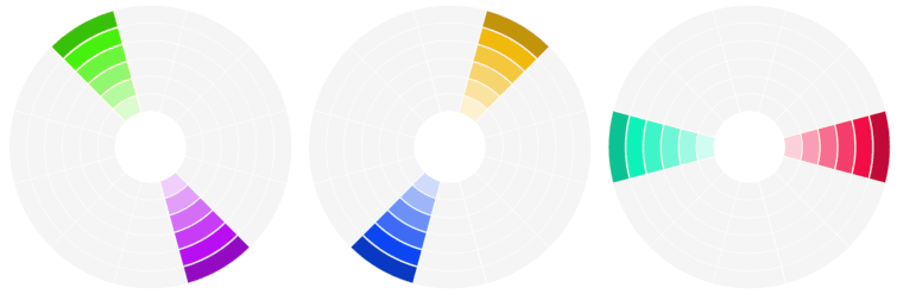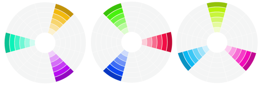 Das letzte Schema ist die Triade. Wie der Name schon sagt, werden hier 3 Farben kombiniert, aber sie werden nicht zufällig ausgewählt. Die Farben in der Triade werden so ausgewählt, dass sie in einem Abstand von etwa 120 Grad nebeneinander liegen. Wenn Sie diese Regel einhalten, erhalten Sie eine schöne Farbkombination.