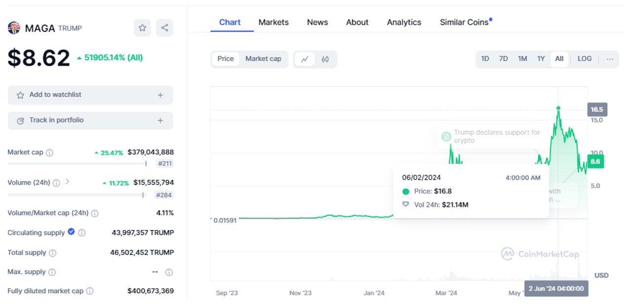 Dank der Tatsache, dass die Blockchains Solana, BNB und Ethereum beteiligt sind, haben TRUMP-Memcoins eine gute Kapitalisierung von 375 Millionen Dollar und eine Liquidität von mehr als 4 %. Sie können an 91 Kryptobörsen getauscht und über die Wallets SolFlare, Backpack und Phantom abgehoben werden. Betrachtet man die ursprünglichen Memcoins, enthält die Liste Bone ShibaSwap mit 115 Millionen Dollar und Milady (110 Millionen Dollar). Beim Durchblättern der ersten Seiten der Bewertung fällt auf, dass es oft niedliche Charaktere gibt – Kätzchen und Hunde.