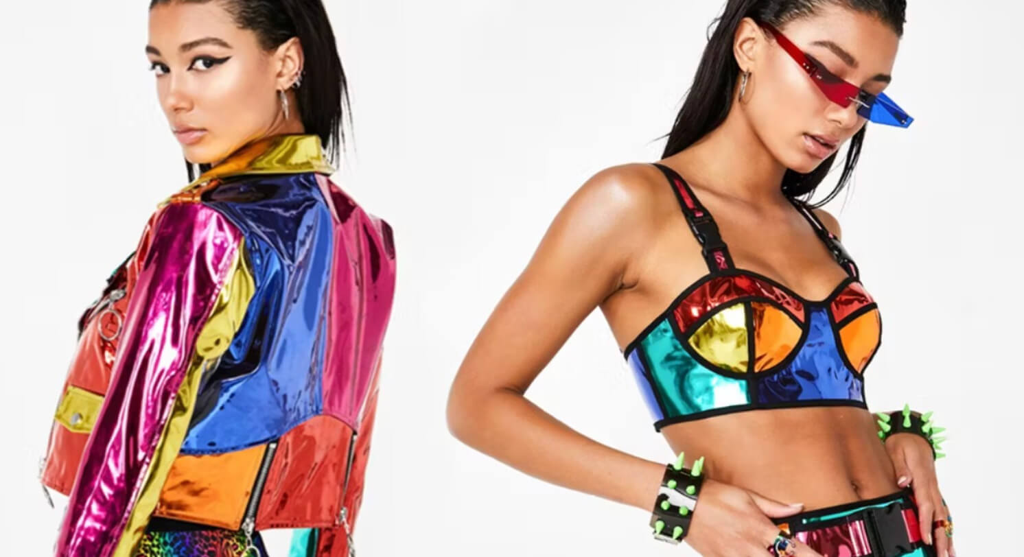 Die Modemarke Dolls Kill produziert beispielsweise T-Shirts mit glitzernden Schriftarten, Pop-ups, Emojis und Pixelkunst in Neonfarben.