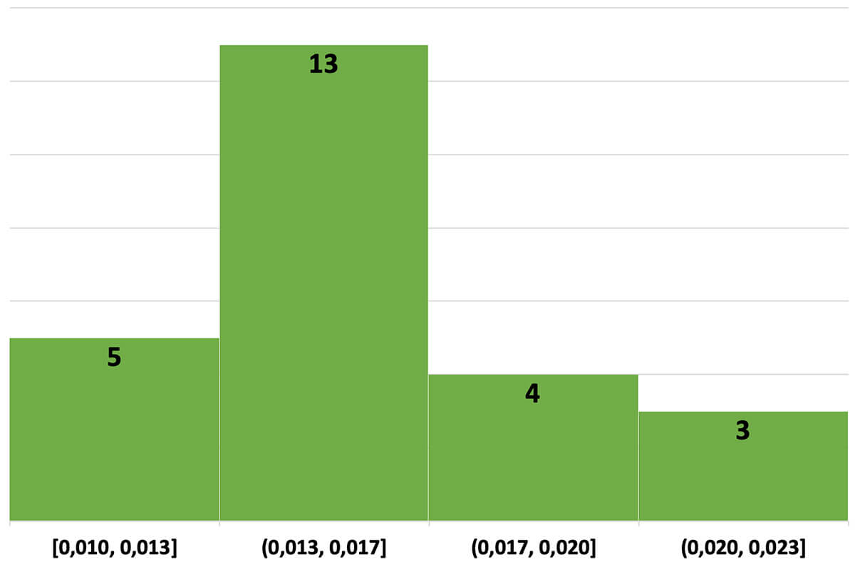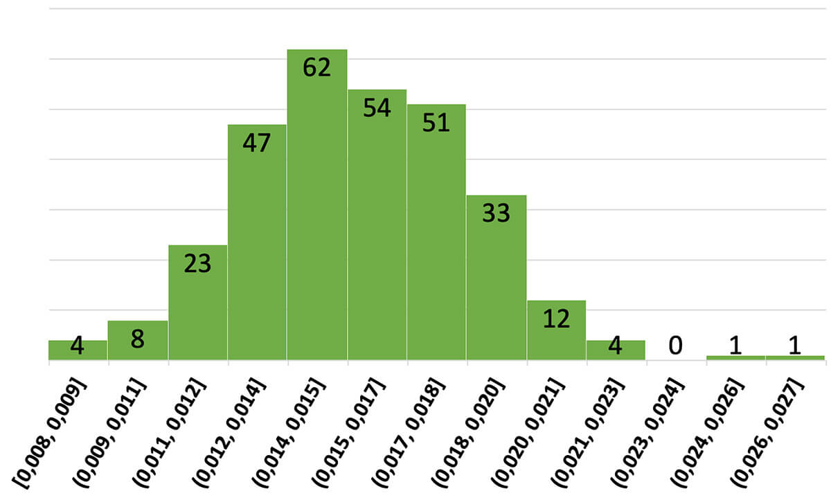 Wenn die Zahl auf 300 Einheiten erhöht wird, könnte das Histogramm folgendermaßen aussehen, wobei Zahlen über 12 $ 265 Fälle ausmachen. Zwischen 12 und 18 $ gibt es jedoch 214 Fälle oder 71,33 % aller Iterationen. Anhand monatlicher oder vierteljährlicher Daten schätzt ein Händler, wohin sich der Kurs bewegen wird, und verwendet diese Parameter, um einen Stop-Loss oder Take-Profit zu berechnen. Die Wahl hängt jedoch auch davon ab, wie sich die Trends im Overnight- oder Tagesformat verändert haben und wie stark die Spitzen waren.
