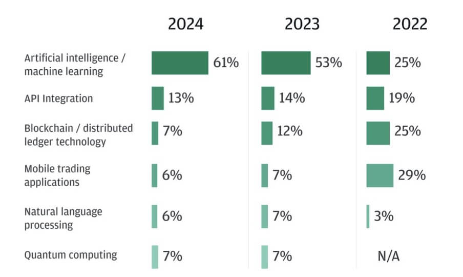 KI-Handelsbots sind eine vielversprechende Nische für Investitionen. Aus der JP Morgan-Umfrage geht hervor, dass immer mehr Anleger die Bedeutung der Einbindung künstlicher Intelligenz in den Handel loben: Im Jahr 2022 nannten nur 25% der Befragten KI als einen wichtigen Faktor bei der Gestaltung des Handels, und im Jahr 2024 tun dies bereits 61%.