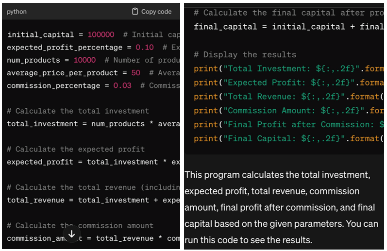 Considérez la tâche suivante: "Écrivez un programme en Python pour générer des bénéfices sur le marché. Capital initial 100 000 dollars, bénéfice attendu 10% de l'investissement, nombre de biens sur le marché 10 000, prix moyen d'un produit 50 dollars, commission de 3%".