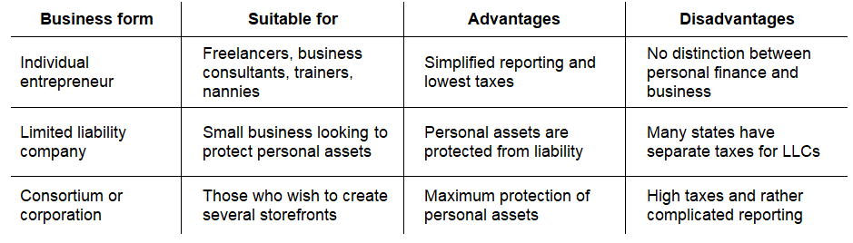 démarrage de votre site e-Commerce est le formulaire de l'organisation des entreprises. Habituellement, les hommes d'affaires novices choisissent une entreprise individuelle pour réduire les impôts et simplifier la déclaration fiscale. Mais ce n'est pas toujours exact, puisque ce formulaire ne protège pas l'argent et les biens d'un homme d'affaires en cas de faillite.