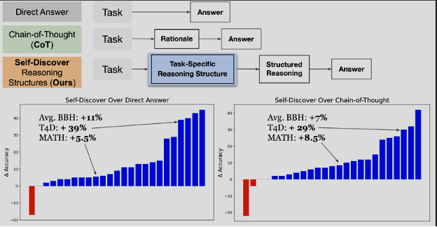 Self-Discover est basé sur le principe d'auto-cohérence et de raisonnement paradoxal, lorsqu'un modèle d'IA crée un algorithme logiquement correct sur la base de la pile impliquée. Le raisonnement universel passe par les étapes de sélection d'un moyen de résoudre le problème, d'adaptation à des conditions spécifiques et d'exécution directe. L'environnement est adapté à la résolution de tests complexes, des structures de raisonnement sont implémentées et transférées vers différents LLM.