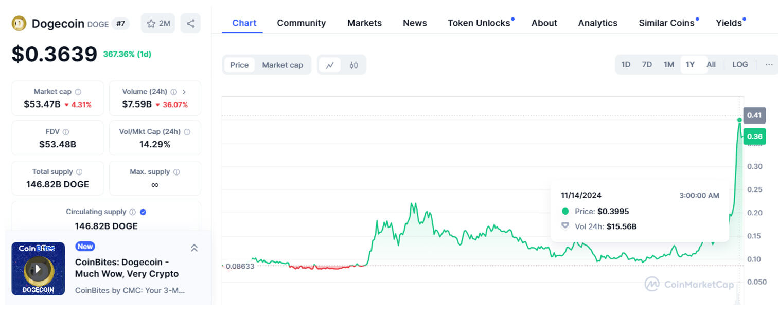 La cryptomonnaie DOGE a une dynamique similaire, passant de 0,1-0,12 $ à 0,41 $ après la victoire de Donald Trump aux élections présidentielles.