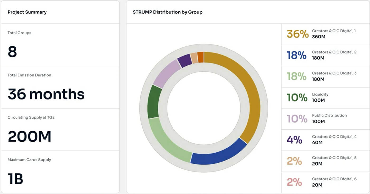 - Scarsità di emissione e controllo dell'offerta: solo 200 milioni di token sono stati emessi per la vendita al pubblico, con l'80% dell'offerta detenuta da organizzazioni associate al presidente degli Stati Uniti Trump (con emissione strutturata nel tempo), il che di per sé limita la vendita immediata pressione.