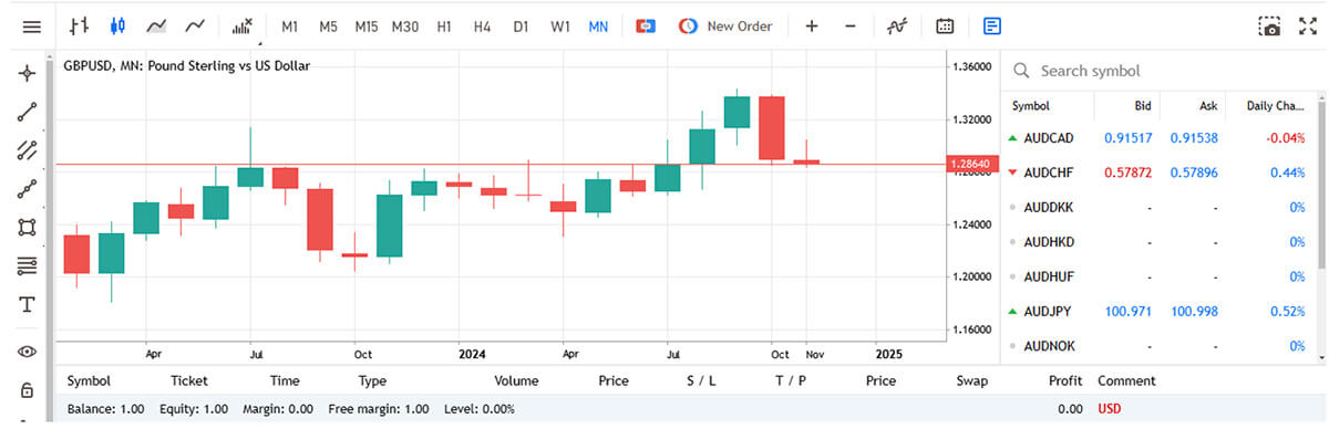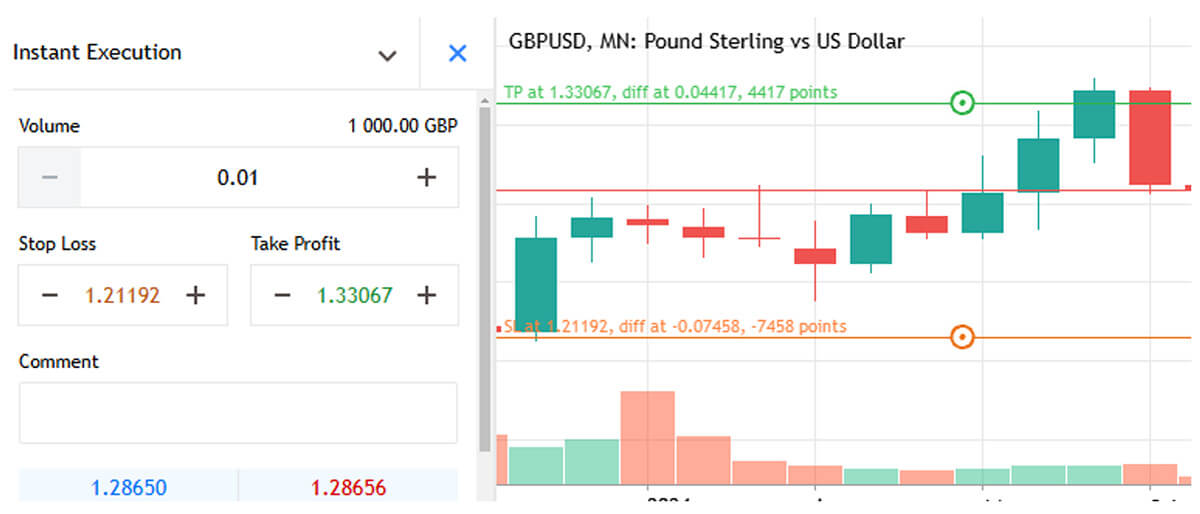 Nei grafici standard vengono utilizzati oggetti grafici nel formato di "candele", linee e barre, integrandoli con intervalli di tempo, che vengono adattati alla strategia di trading scelta (ora, giorno, settimana o mese). I grafici OHLC e gli intervalli tick mostrano chiaramente la situazione attuale. Il robot advisor integrato offre parametri stop-loss e take-profit consigliati, ma il trader può impostare i propri, in base a ipotesi e calcoli, ipotesi ed esperienza.
