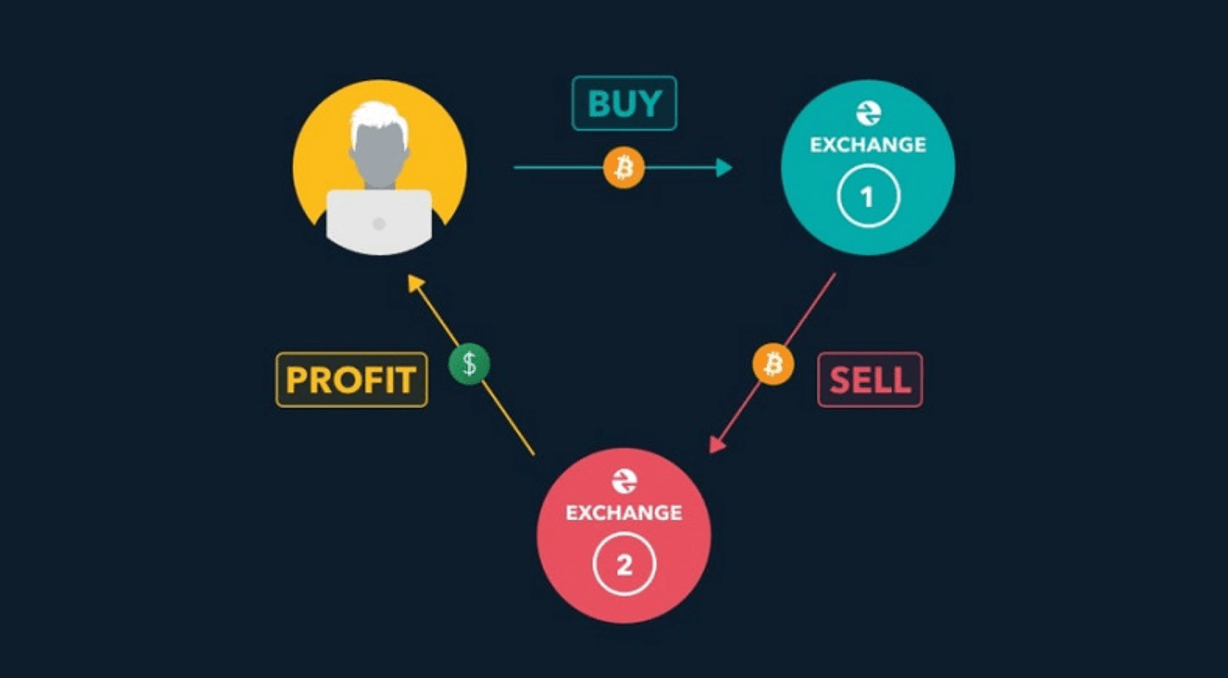 O bot compra uma moeda em uma bolsa e a vende em outra a um preço mais alto. |