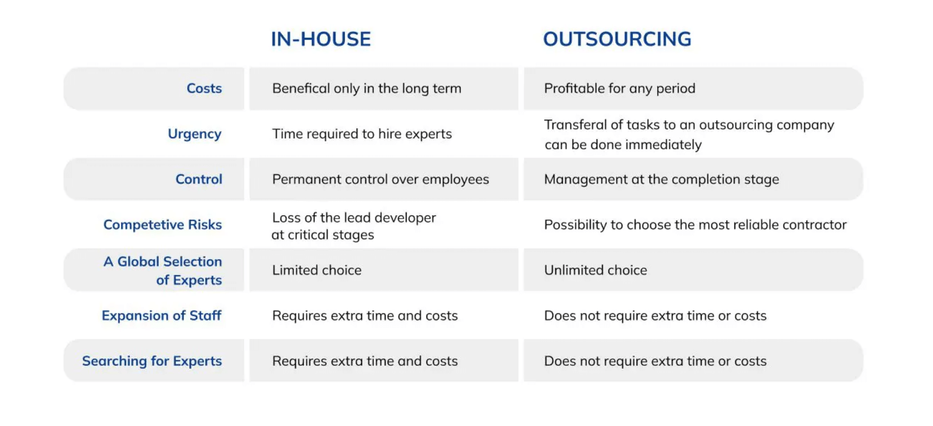 A primeira opção oferece um negócio melhor porque você trabalha com especialistas de nicho. Encontrar e construir um departamento de desenvolvimento interno leva tempo e esforço.