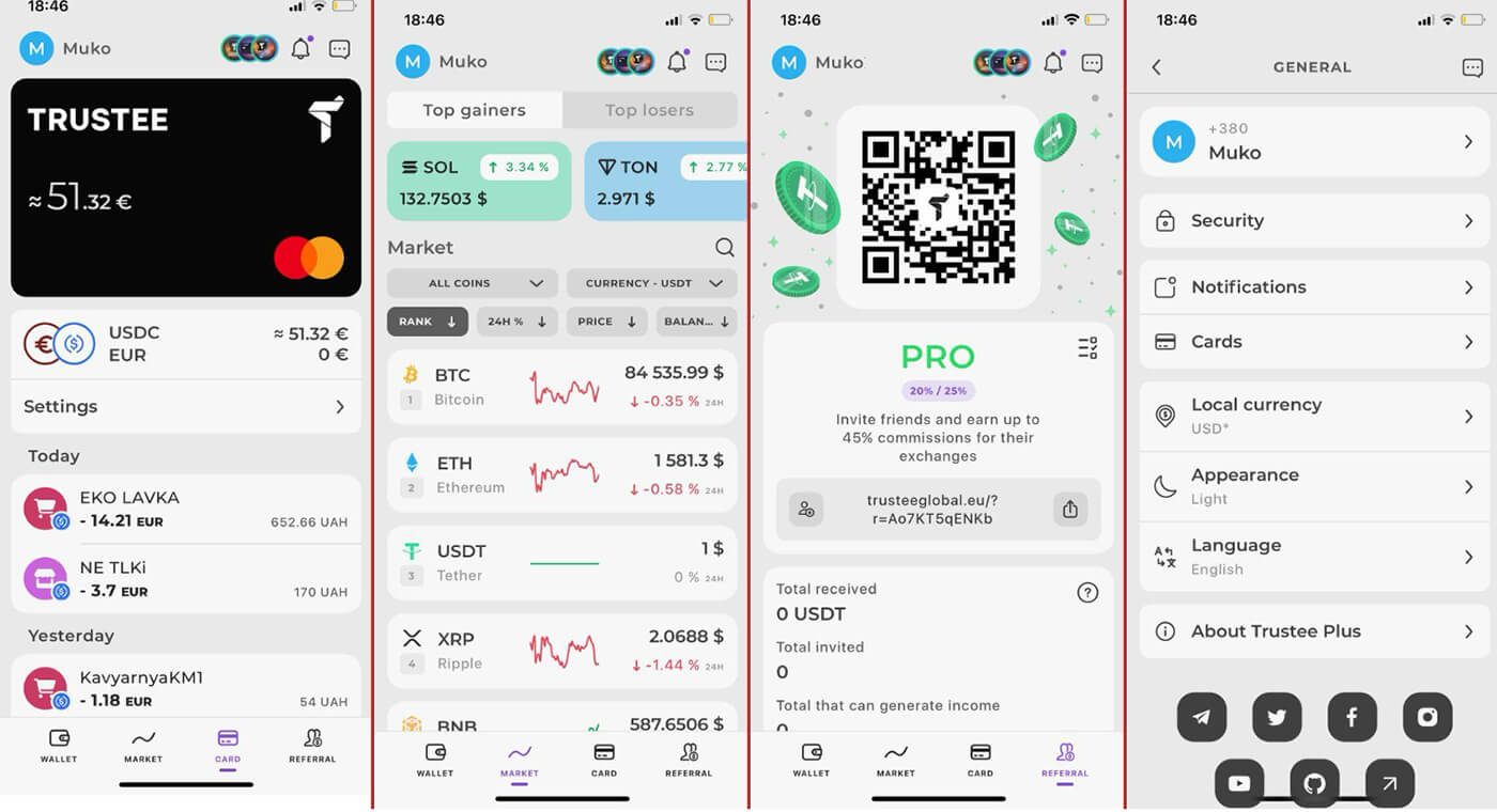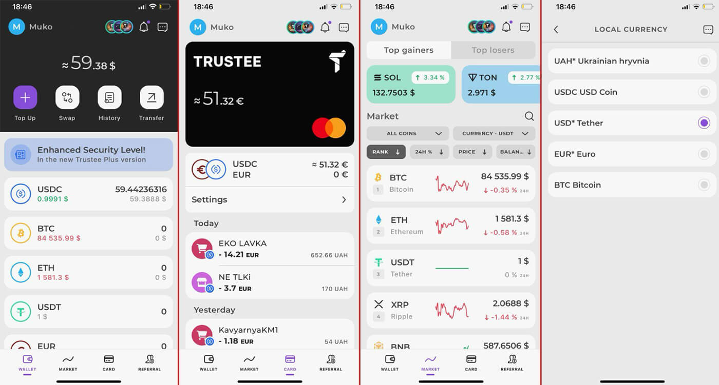 Мультивалютный кошелёк: Trustee Plus поддерживает BTC, ETH, USDT, TON, BNB и десятки других активов. В приложении реализован non-custodial кошелёк: приватные ключи остаются у пользователя, но при этом доступны все функции классического банка.