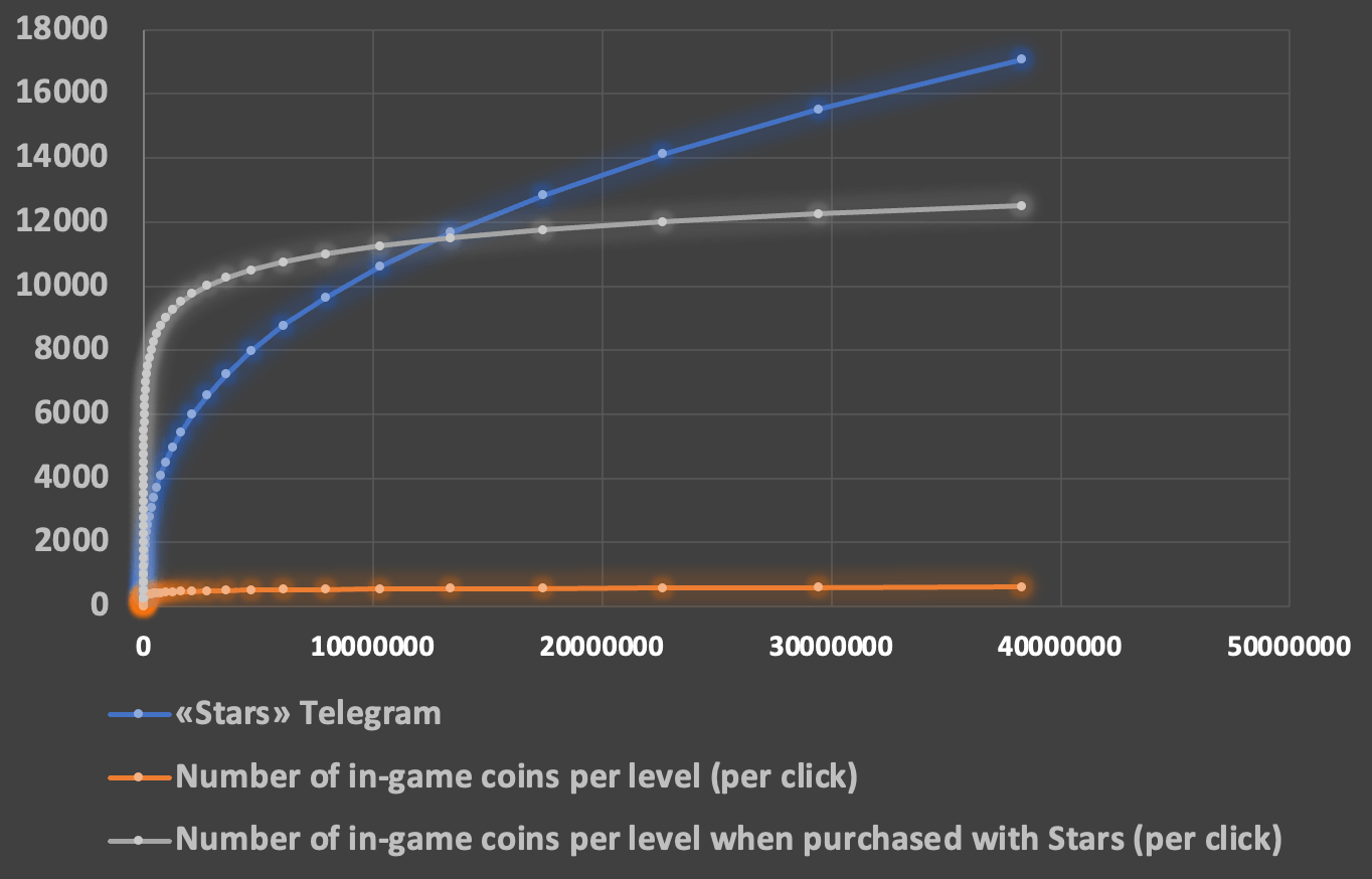 При платном варианте прохождения (за крипту или фиат) при внесении $4842 (372,5 тыс. «Stars» Telegram) цена одного тапания достигнет 25 тыс. единиц игровой валюты, так как рост ценника будет происходить в три раза медленнее. Предположим, что кликер заинтересует полмиллиона геймеров и 20 % из них станут постоянными. Платные функции из этого числа выберет 10–15 % человек. Выходит, что на первом-втором этапе жизненного цикла (за год-два), от платных клиентов удастся привлечь $72 млн. при условии полной покупки всех возможностей апгрейда персонажа.