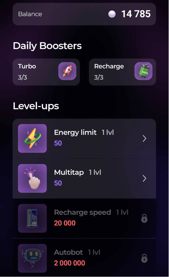 Команда Merehead подробно объясняет механику и аспекты кликера, зная, как создать блокчейн игру. Параметры набора внутриигровых активов показываем без учета ежедневных бустеров Turbo & Rechardge (2 вида и 3 попытки), которые в разы усиливают мощность и скорость восстановления энергии. Для базового улучшения бустеров поинты (в пределах 300 К – 3 млн.) добывают из категории Earn (подразделы Quests, Battles & Tasks).