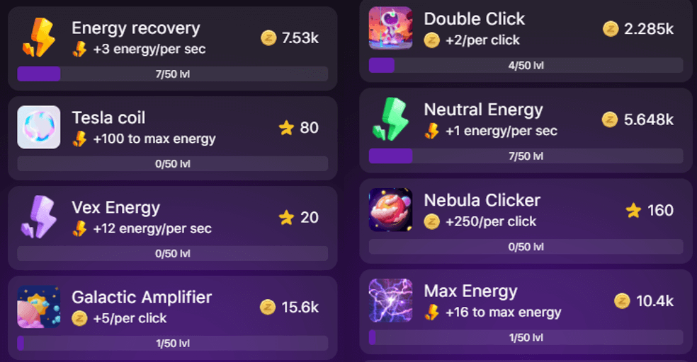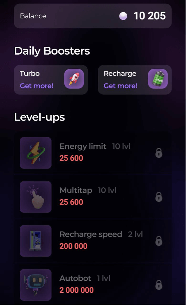 Количество получаемых внутриигровых монет можно увеличивать, покупая в магазине за игровые монеты или «звезды» пакеты возможностей. Монеты, в свою очередь, можно не только заработать, тапая по экрану iOS или Android, но и в разделе Tasks (зайти в канал или группу, подписаться на них (отписка не повлияет на количество монет), посмотреть рекламу, пригласить друзей). Получение монет и энергии должно быть сбалансировано – при дефиците энергии участник не сможет набрать активы.