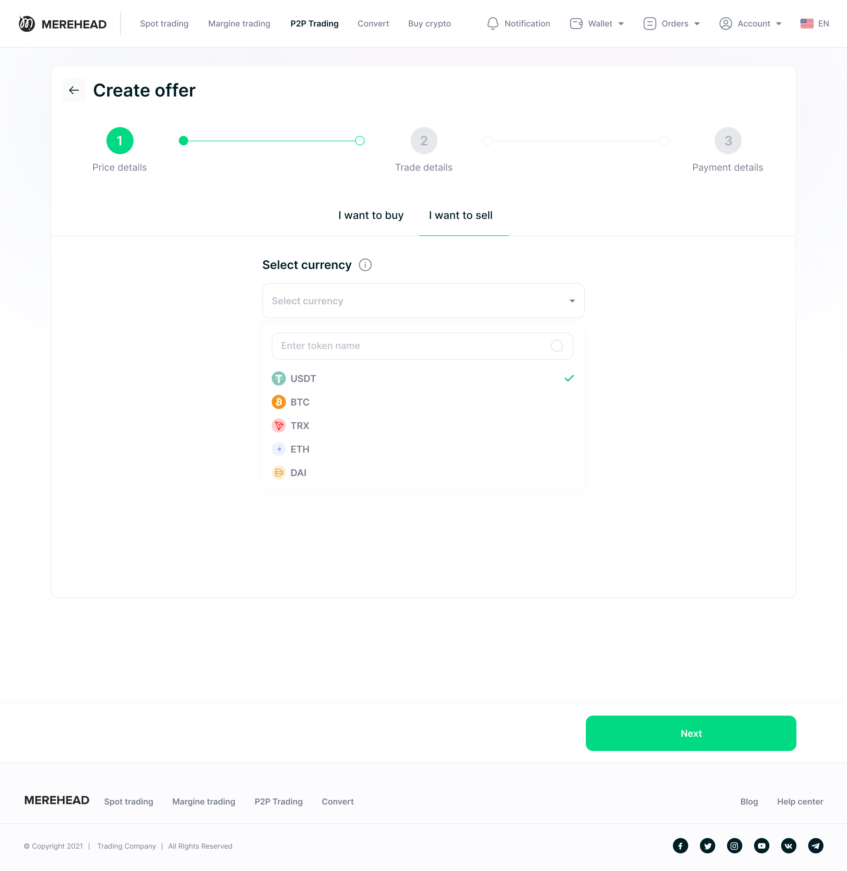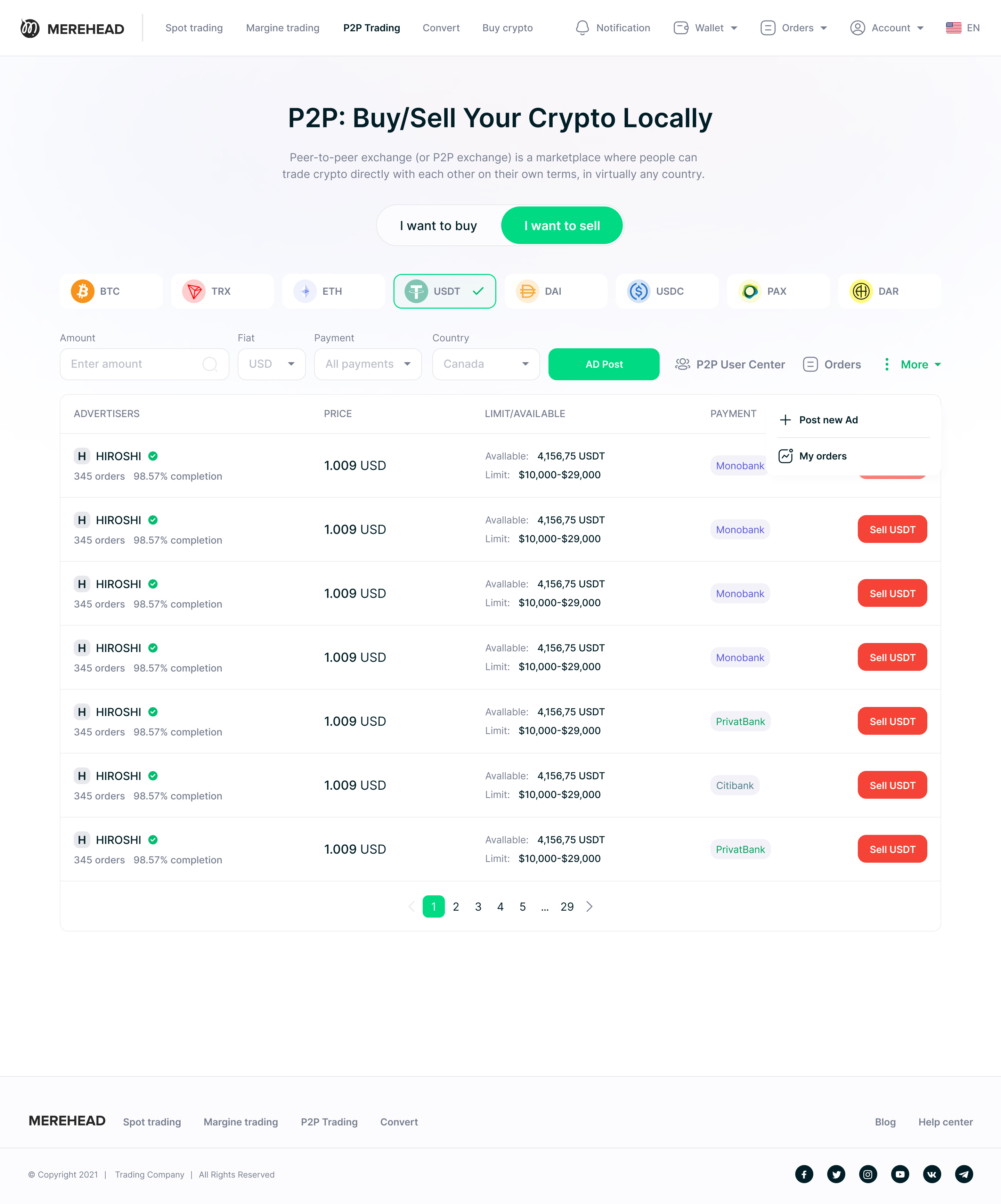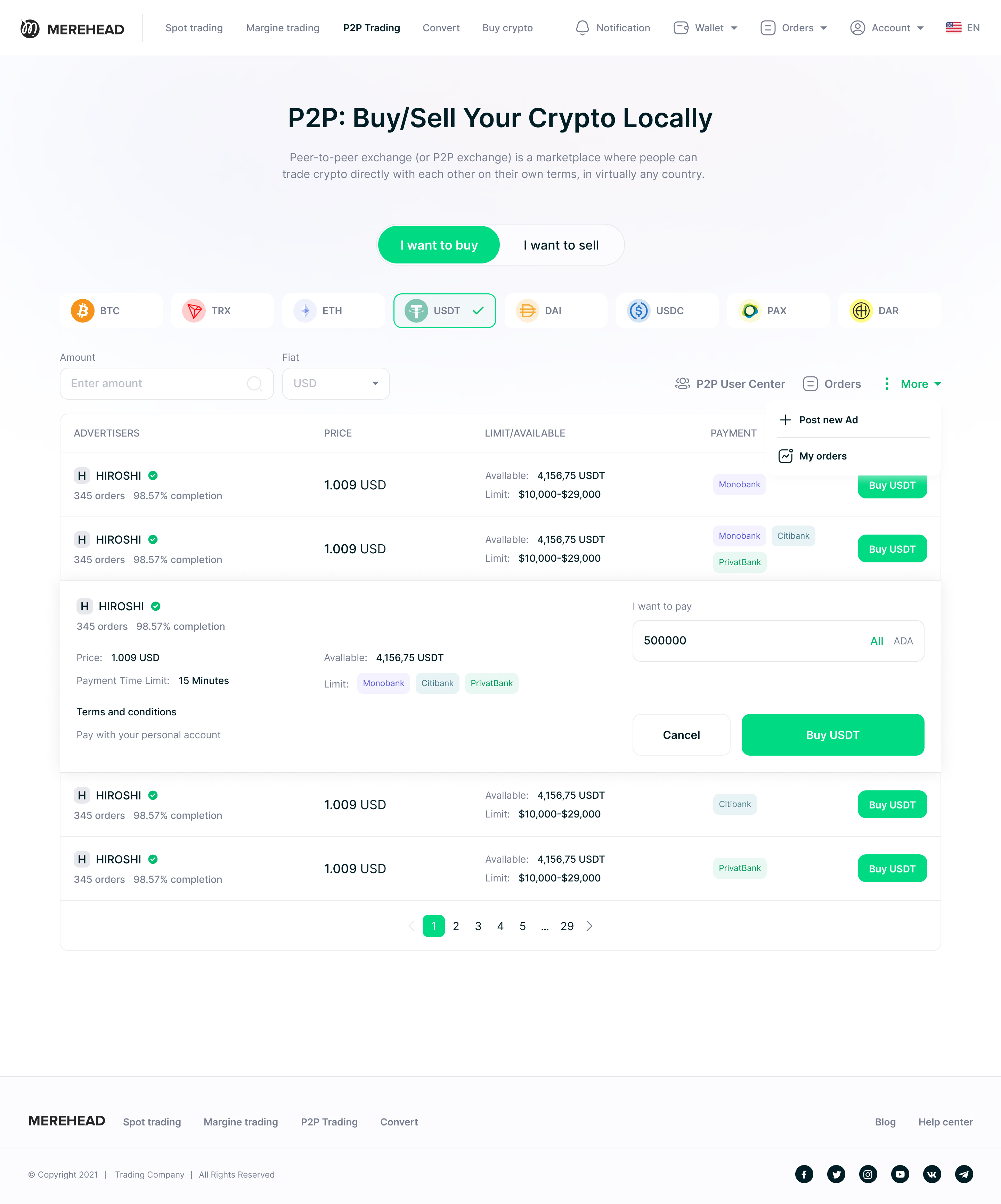 Продавец выставляет криптоактив (BTC, ETH, USDT) с указанием цены и предпочтительных способов оплаты.