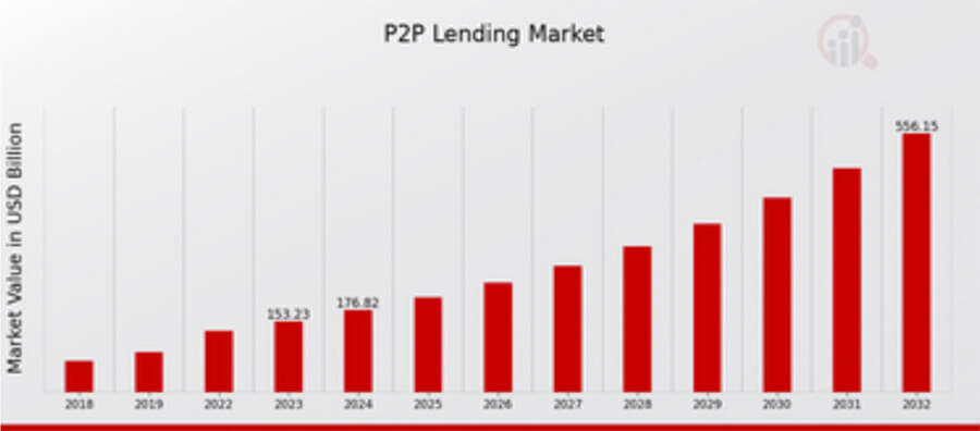 В 2023 году объем рынка P2P-кредитования оценивался в $153,23 млрд. Причем CAGR этой ниши — около 23%. Так что по прогнозам GlobeNewswire, в 2030 году показатель может достигнуть $800+ млрд. По данным Market Research Future, результат будет несколько ниже, но и они предсказывают внушительный объем рынка $556,15 млрд к 2032 году.