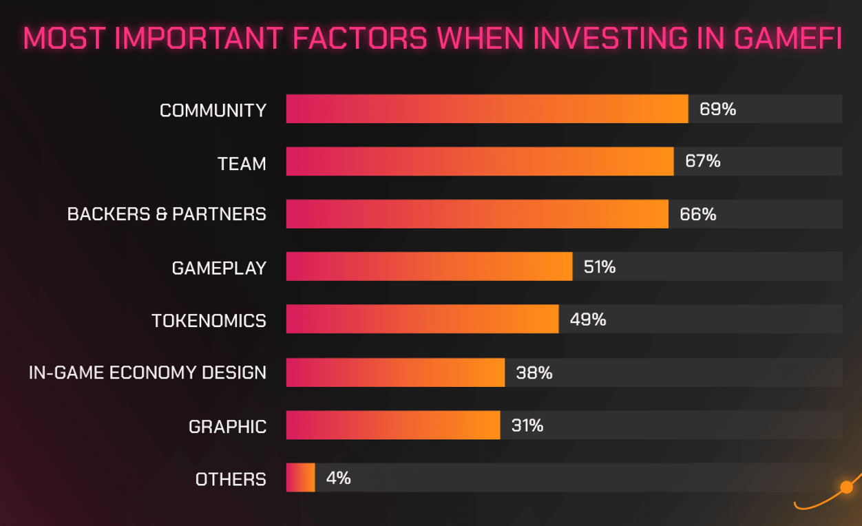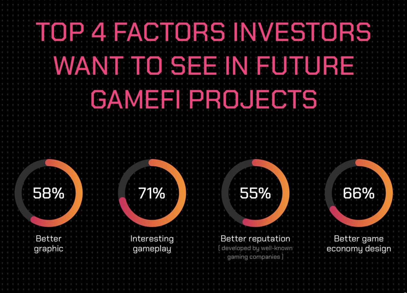Большую перспективность сложных AAA игр с интеграцией опции NFT подтверждают результаты опроса, проведенного ChainPlay & Storible среди 2,400+ инвесторов в GameFi секторе. Более привлекательными для инвестиций считаются игры с интересным геймплеем, проработанной графикой и сложной экономической моделью. Что существенно отличается от практически пустых идей разработки своих мемкоинов и продвижения их исключительно для спекуляций.
