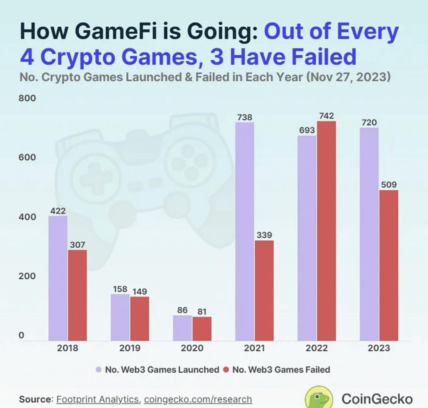 GameFi сектор показывает стабильный рост: в 2024 году его капитализация оценивались в $31 млрд, а по прогнозам к 2031 году показатель может превысить $90 млрд. Но при этом не стоит оценивать риск инвестиций в GameFi сектор, как и низкий. Из 3,000 игр, запущенных с 2018 по 2021 год, меньше 700 имеют активную базу игроков в 2024 году. Среднегодовой уровень отказа от игры составляет ~80%. Количество активных адресов игроков с 2021 по 2023 год уменьшилось на 58%.