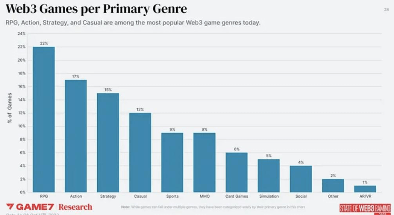 Согласно исследованиям Game7, в 2024 году большую часть рынка GameFi занимают RPG (22%), на втором месте - Action (17%), на третьем - Strategy (15%).
