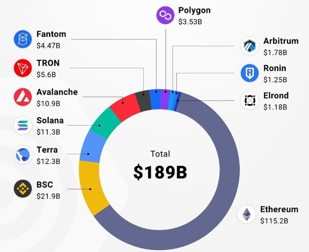 Лучшие блокчейны по количеству активов, заблокированных в DeFi.
