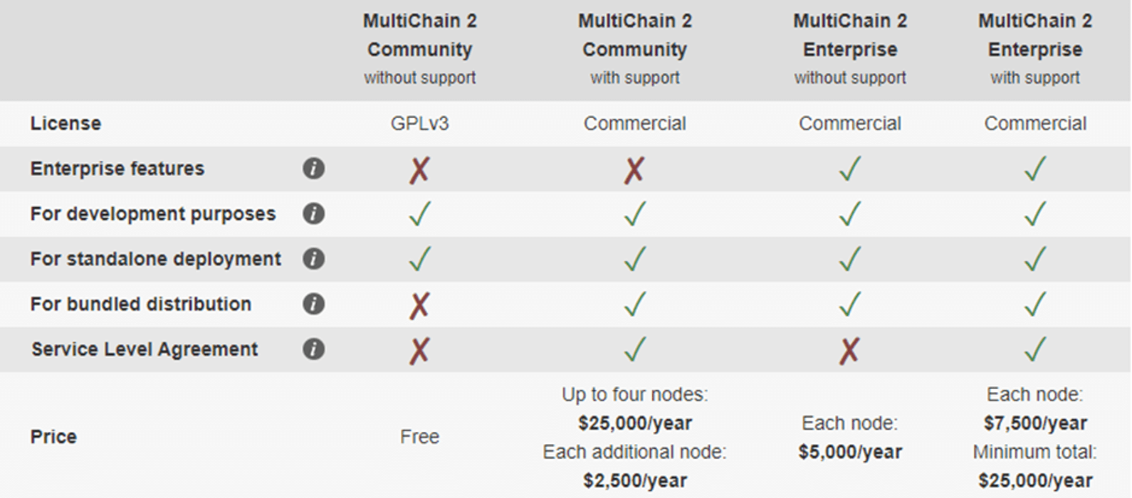 Стоимость решений MultiChain находится в промежутке $5 - $25 тыс. в год. Например, используя все преимущества фреймворка без поддержки сообщества, вам нужно будет заплатить $5 тыс. за развертывание одной ноды. Также существуют бесплатные пакеты.