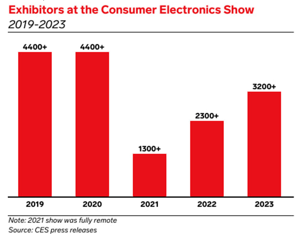 В течении последних трех лет количество представленных экспонентов значительно уменьшилось. Тем не менее, интерес к CES стремительно возвращается, и уже в 2024 году организаторы ожидают увидеть более четырех тысяч различных представителей.
