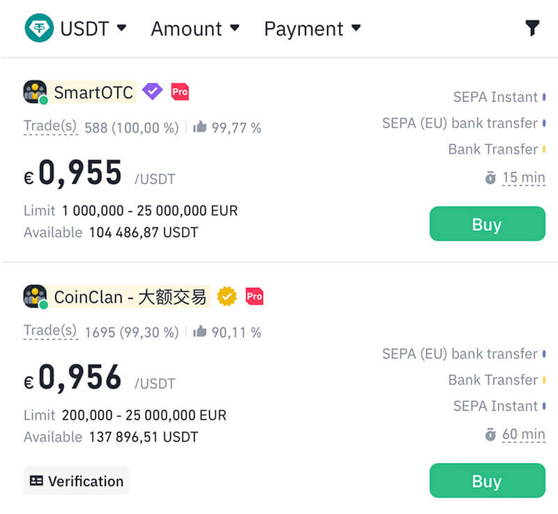 En popüler Binance P2P borsasında eşler arası emir defteri örneği