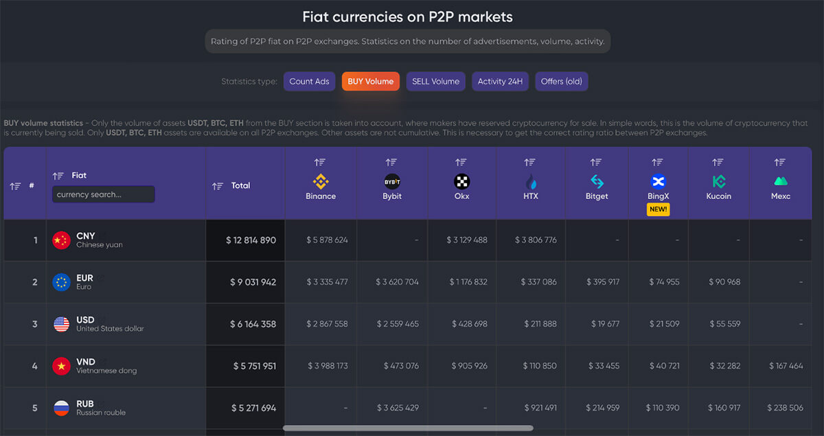 Birçok borsacı sadece 1 kripto paraya odaklanmıştır - BTC. İkinci en popüler seçenek: BTC ve ETH + USDT/USDC steiblcoin'leri. Binance P2P, Bybit P2P gibi en büyük projeler düzinelerce üst düzey kripto para birimini destekler (bunların likiditesini ve acente/yüklenici bulma hızını sürdürmenin daha zor olduğunu unutmayın). Ana vurgu, itibari para birimlerinin ve ödeme hizmetlerinin çeşitliliğidir. P2PArmy istatistiklerine bakarsanız, 2024'te işlem hacmi açısından en iyi para birimleri şunlardır: