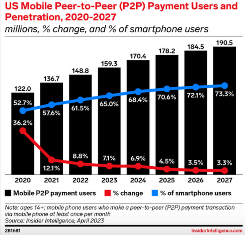 Mobil cihazlar giderek daha fazla eşler arası işlemler için kullanılıyor. Dahası, Insider Intelligence tahminlerine göre, sayıları artmaya devam edecek: ABD'de 2023'te mobil P2P pazarında halihazırda 159,3 milyon katılımcı vardı ve 2027'ye kadar sayıları 190,5 milyona ulaşabilir.